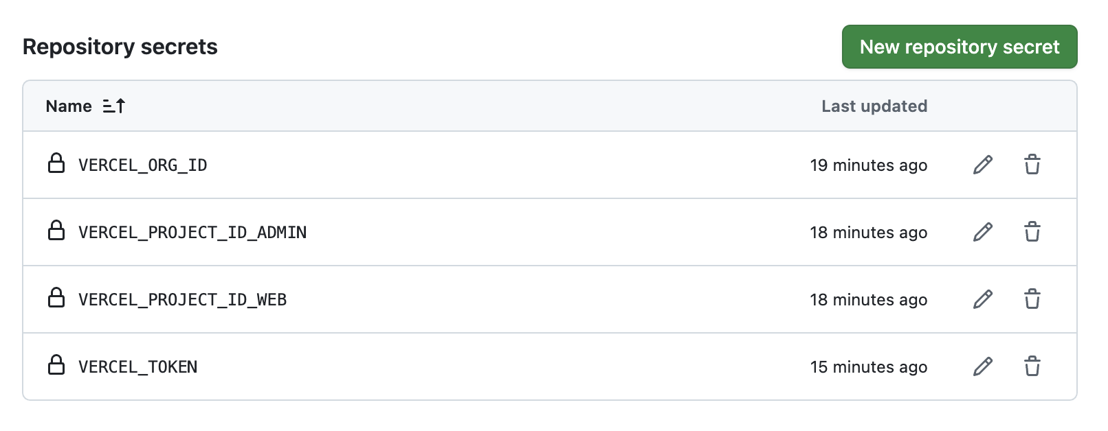 두 프로젝트 모두 같은 팀(Org)소속이라 VERCEL_ORG_ID 하나만 등록하였다.